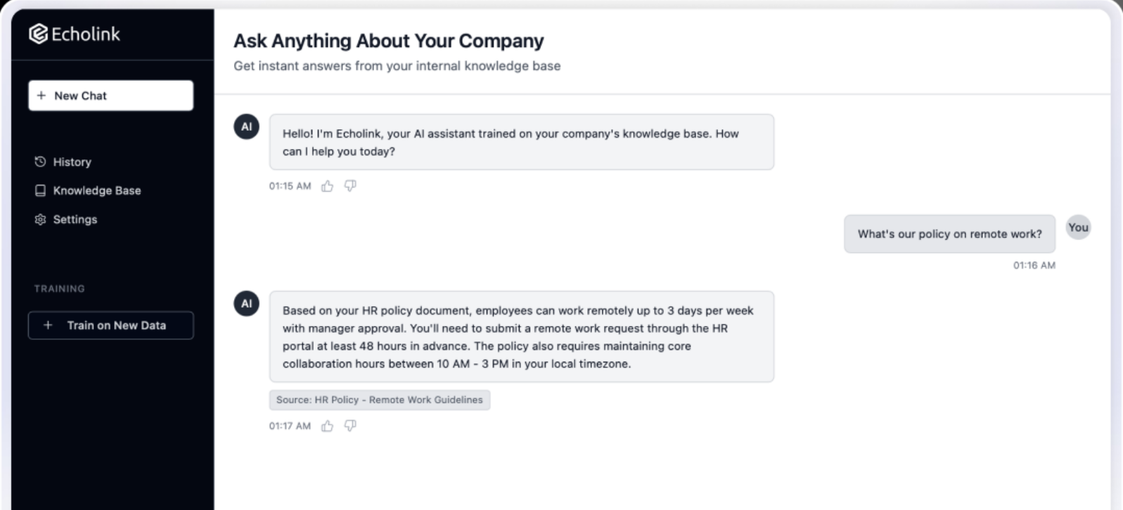 Discover how Echolink helps your employees get fast, accurate responses to company-specific questions. Our AI assistant connects seamlessly to your knowledge base, delivering reliable insights in real time.